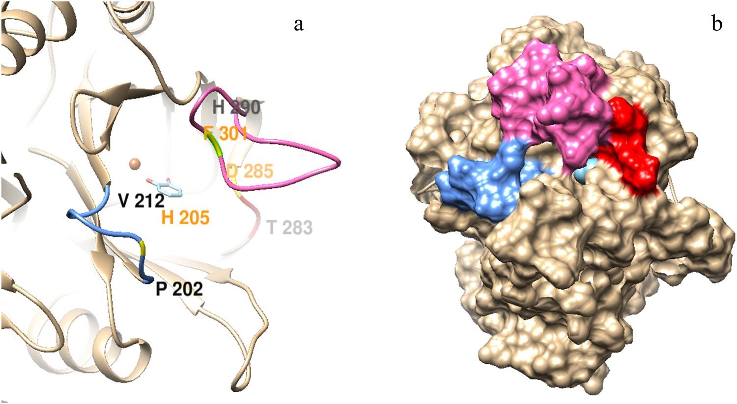 图3. (a) C端结构域及,(b)酶底物复合体