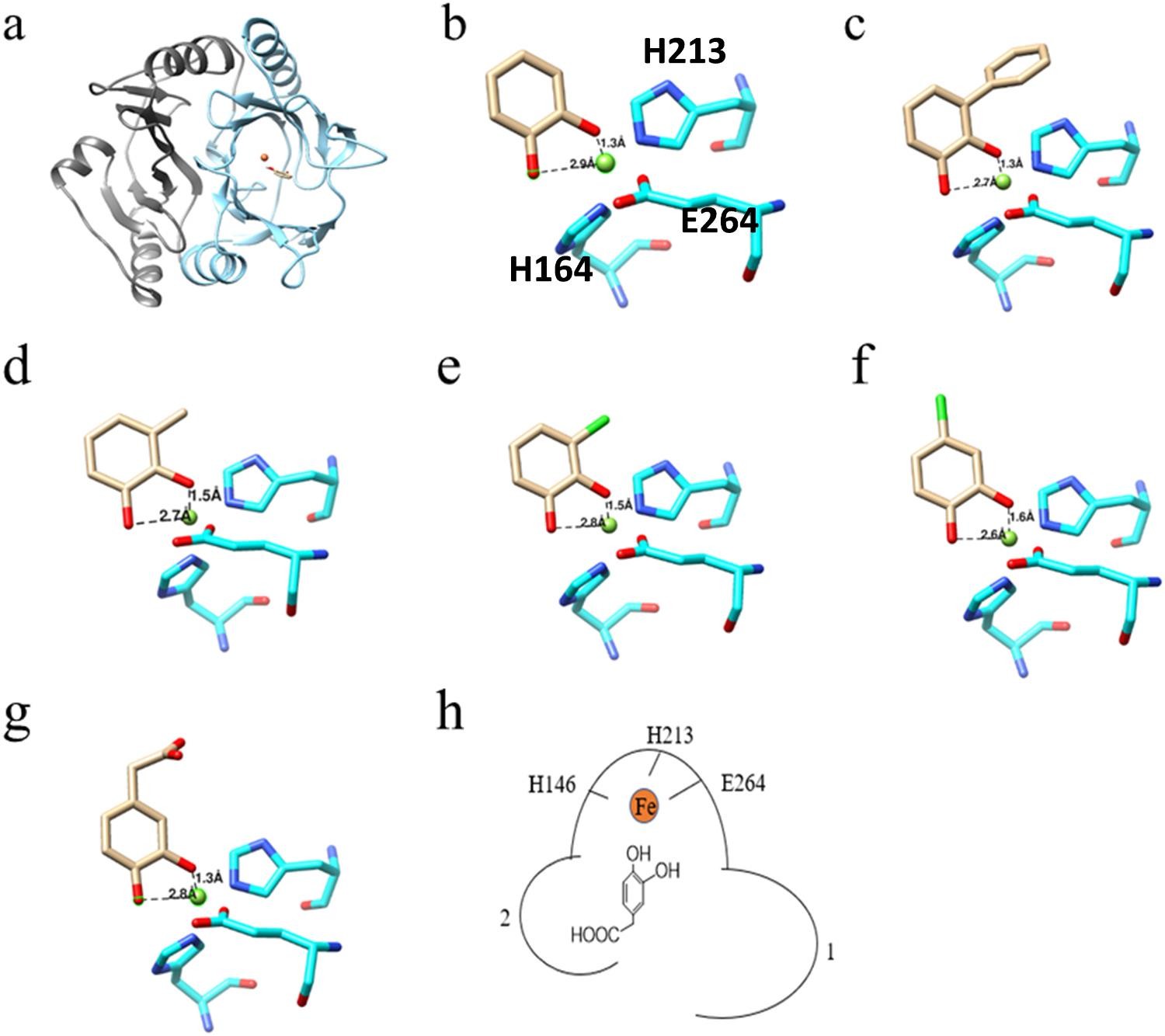 高仁钧教授团队从嗜热微生物弯曲热单孢菌中筛选得到高活性的外二醇双加氧酶Tcu3516,并对其酶学性质进行了表征。通过对Tcu3516序列相似性分析,发现其属于邻氧螯合家族(VOC)/Ⅰ型,且该酶与已报道的其他双加氧酶的序列一致度仅为25-44 %。经过系统发育树分析进一步证明,该酶属于独特分支的、尚未被研究的双加氧酶。酶学性质表征表明,该酶最适温度为50 ℃,最适pH为9.0。且在55 ℃时,该酶仍具有良好的热稳定性。Tcu3516具有广泛的底物适应性,对多种天然底物,包括儿茶酚、3-甲基儿茶酚、3-氯儿茶酚、4-氯儿茶酚、2,3-二羟基邻苯二酚和3,4-二羟基苯基乙酸均有催化能力,特别适合用于环境污染物的清除。通过对Tcu3516进行同源建模,并与底物分子对接(图1),动力学模拟了解该酶与底物的作用方式。并在此基础上,通过半理性设计对其催化口袋末端的环结构进行改造,获得性能良好的突变体。