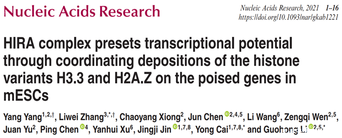 ✅雷竞技raybet在线-英雄联盟蔡勇教授团队与中国科学院生物物理研究所李国红研究员团队合作,利用基因编辑技术结合CUT&Tag-ChIP-Seq等基因组学分析方法,阐释了小鼠胚胎干细胞(mESC)中组蛋白变体H3.3和H2A.Z之间通过协同调节增强子和启动子调控区域的染色质动力学来启始基因转录的作用机制。相关研究结果以“HIRA complex presets transcriptional potential through coordinating depositions of the histone variants H3.3 and H2A.Z on the poised genes in mESCs”为题,2021年12月11日在线发表于Nucleic Acids Research。