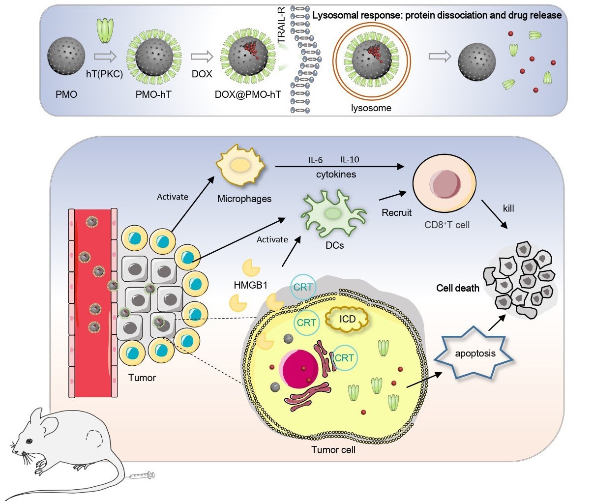 于湘晖教授、于彬教授团队的另一项关于肿瘤靶向免疫治疗的研究于2022年4月15日在生物医学期刊《Acta Biomaterialia》上发表(TRAIL-modified, doxorubicin-embedded periodic mesoporous organosilica nanoparticles for targeted drug delivery and efficient antitumor immunotherapy,2022,143:392-405, https://doi.org/10.1016/j.actbio.2022.03.001.)。团队与吉林大学无机合成与制备化学国家重点实验室乔振安教授合作,利用TRAIL修饰的周期性介孔二氧化硅(PMO)作为药物载体携载化疗药物,在小鼠模型上通过静脉给药实现了肿瘤的靶向和协同杀伤作用,并引发了有效的抗肿瘤免疫。研究首次证实TRAIL修饰的PMO能够在体内外诱导肿瘤细胞产生ICD,进而通过激活DCs,提升肿瘤杀伤T细胞的浸润和活性,产生更好的抗肿瘤效果。该研究为设计具有抗肿瘤免疫激活功能的靶向纳米药物提供了新的思路。