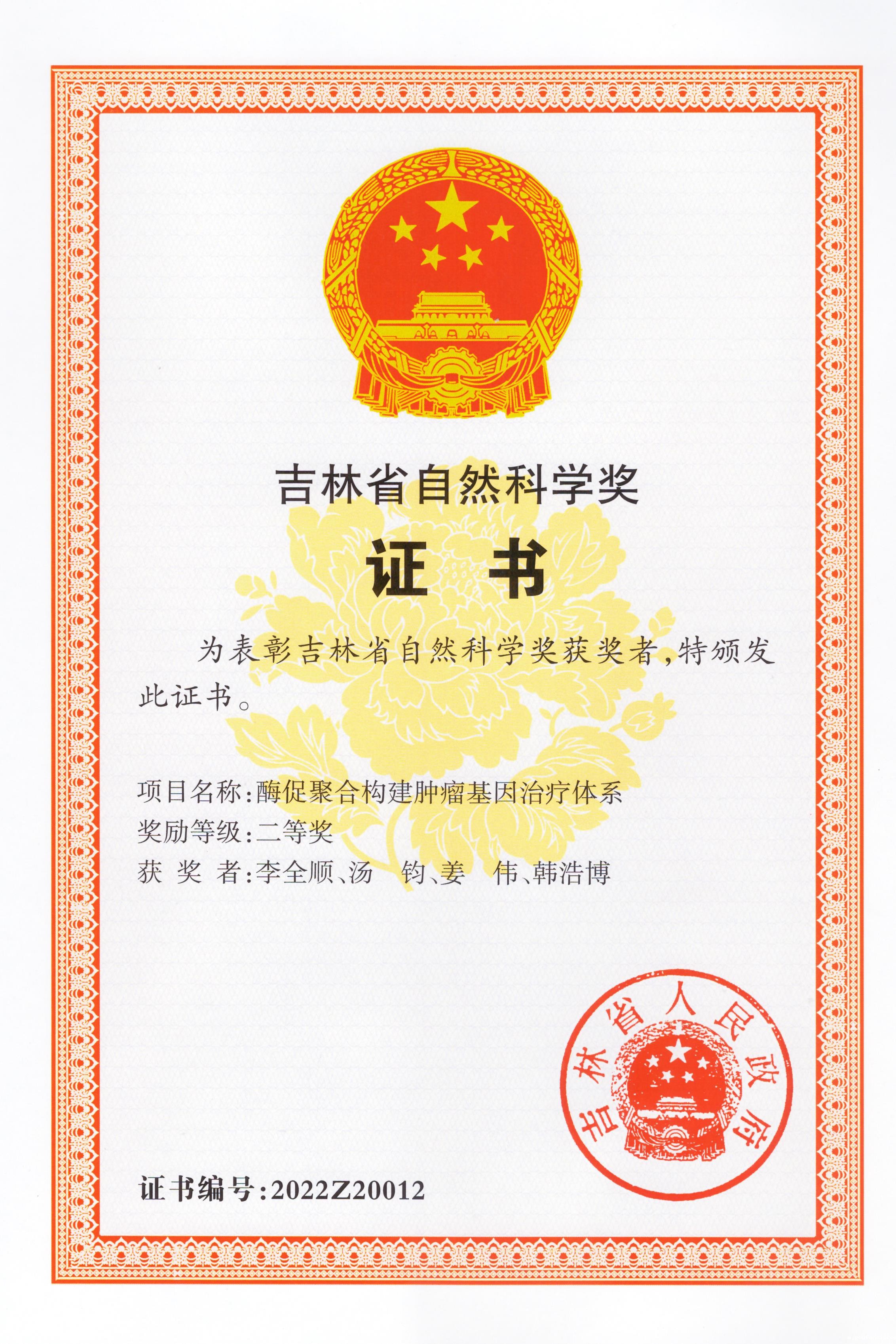 2022年12月9日,吉林省人民政府发布了《关于2022年度吉林省科学技术奖励的决定》。由我院李全顺教授团队完成的“酶促聚合构建肿瘤基因治疗体系”项目荣获吉林省自然科学奖二等奖(获奖人:李全顺、汤钧、姜伟、韩浩博)。