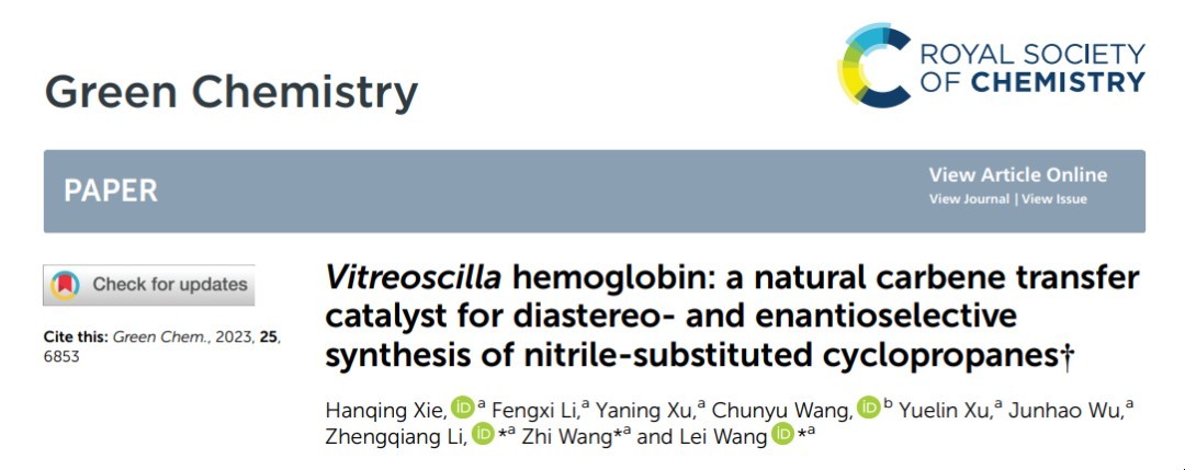 通过对血红蛋白结构和催化机制的进一步理解,课题组以血红蛋白具有的卡宾转移酶活力为基础,探索其在手性合成中的应用,结合分子对接技术多角度分析催化机制,以“Vitreoscilla hemoglobin: A natural carbene transfer catalyst for diastereo- and enantioselective synthesis of nitrile-substituted cyclopropanes”为题,在国际权威学术期刊《Green Chemistry》(影响因子9.8,中科院分区一区)在线发表研究论文。论文中报告了一种对环境友好的策略,将原位生成的重氮试剂与生物催化相结合,用于芳香烯烃的不对称环丙烷化。论文第一完成单位为✅雷竞技raybet在线-英雄联盟,✅雷竞技raybet在线-英雄联盟博士谢汉青为该论文的第一作者,吉林大学分子酶学工程教育部重点实验室王磊、王智、李正强教授为该论文的共同通讯作者。