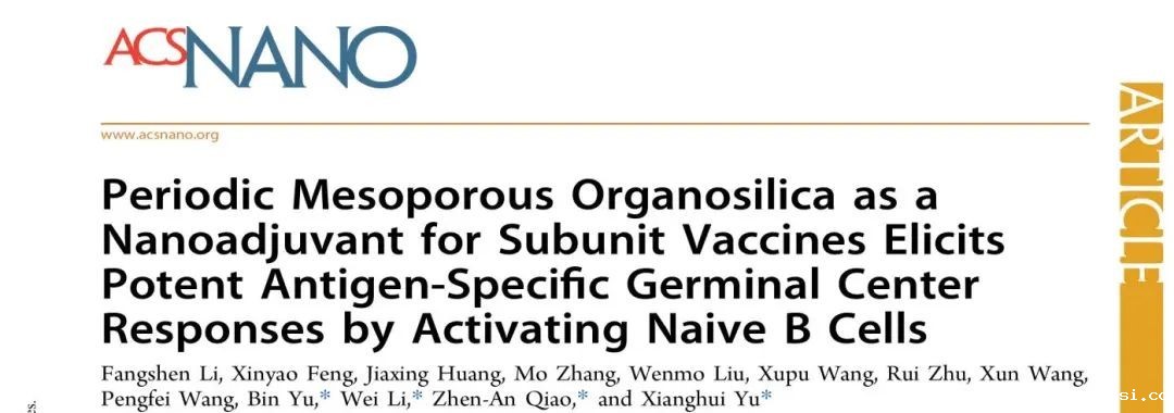 于湘晖教授团队联合吉林大学无机合成与制备化学国家重点实验室乔振安教授和复旦大学化学系李伟教授以周期性介孔有机硅(PMO)作为新型亚单位疫苗佐剂,揭示其通过CLR通路直接激活静息B细胞,在免疫后早期引发强效的生发中心反应,并最终诱导机体产生广谱且持久的体液免疫应答和强效的细胞免疫应答。研究论文“Periodic mesoporous organosilica as a nanoadjuvant for subunit vaccines elicits potent antigen-specific germinal center responses by activating naive B cells”发表在《ACS Nano》杂志(影响因子17.1,中科院分区一区)上。论文第一完成单位为✅雷竞技raybet在线-英雄联盟,✅雷竞技raybet在线-英雄联盟博士李仿燊为本论文的第一作者,吉林大学于湘晖教授和于彬教授,乔振安教授,复旦大学李伟教授为该论文的共同通讯作者。