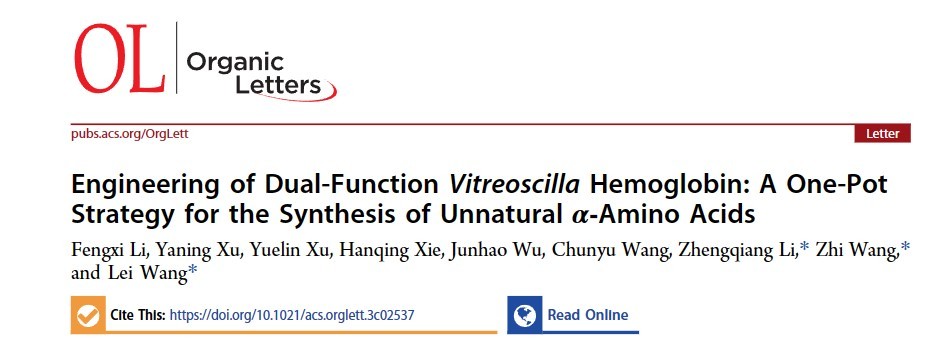课题组进一步探索血红蛋白在非天然反应中的应用潜力,同时对血红蛋白的改造方式进行深入学习和拓展,使其获得新功能,以“Engineering of Dual-Function Vitreoscilla Hemoglobin: A One-Pot Strategy for the Synthesis of Unnatural α-Amino Acids”为题,在国际权威学术期刊《Organic letters》(影响因子5.2,中科院分区一区)在线发表研究论文。论文中提出了一种高效绿色的非天然氨基酸合成路线,通过工程化改造透明颤菌血红蛋白(VHb),使其成为同时具有高效的过氧化物酶和卡宾转移酶活力的双功能蛋白,催化以苯胺、重氮化合物、烷基硼酸类化合物为底物的体系先后通过N-H插入反应和C-H sp3烷基化一锅法合成了非天然氨基酸的衍生物,并且获得了理想的底物适用范围。这项工作也为后续血红蛋白的定向进化提供了更多的借鉴和依据。论文第一完成单位为✅雷竞技raybet在线-英雄联盟,吉林大学鼎新博后李奉熙和博士许雅宁为该论文的第一作者,吉林大学王磊、李正强教授为该论文的共同通讯作者。
