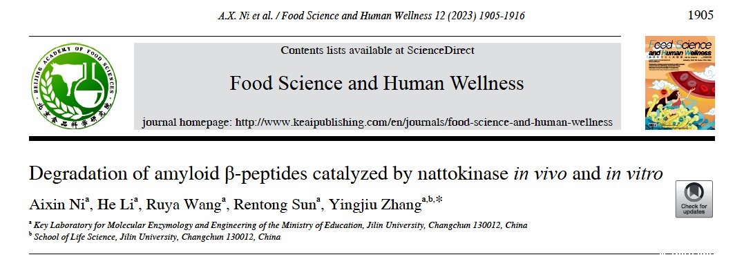 吉林大学分子酶学工程教育部重点实验室的张应玖教授课题组在获得纳豆激酶(Nattokinase,NK)的基础上,研究发现NK可以有效催化Aβ42聚集体的降解,同时可降低生理条件下血液中Aβs的水平,并间接促进了阿尔茨海默症模型鼠脑内Aβ42水平的下降和淀粉样斑块的减少。该成果以“Degradation of amyloid β-peptides catalyzed by nattokinase in vivo and in vitro”为题,发表在《Food Science and Human Wellness》(影响因子8.022)上。论文第一完成单位为✅雷竞技raybet在线-英雄联盟,✅雷竞技raybet在线-英雄联盟博士倪爱新为该论文的第一作者,吉林大学张应玖教授为该论文的唯一通讯作者。