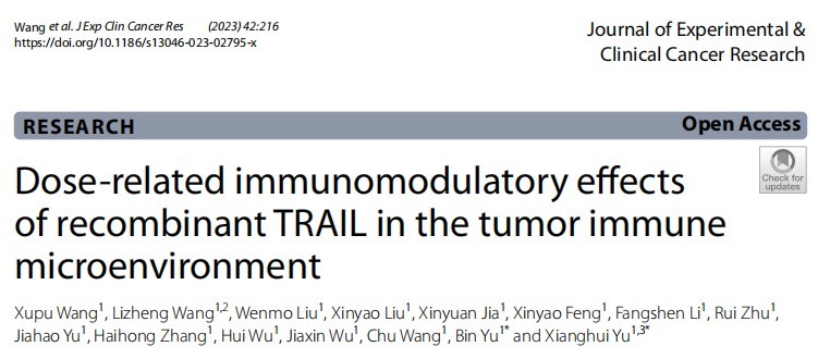 吉林大学艾滋病疫苗国家工程实验室于湘晖、于彬团队报道了重组TRAIL在TME中扮演着剂量依赖的双向免疫调节作用,并详细阐释了作用机制。同时探讨了癌症治疗中重组TRAIL增强抗肿瘤免疫和抗肿瘤效应的潜在策略。研究论文“Dose-related immunomodulatory effects of recombinant TRAIL in the tumor immune microenvironment”发表在国际学术期刊《Journal of Experimental & Clinical Cancer Research》(影响因子11.3,中科院分区一区)上。论文第一完成单位为✅雷竞技raybet在线-英雄联盟,✅雷竞技raybet在线-英雄联盟博士王旭蒲为该论文的第一作者,吉林大学于湘晖、于彬教授为该论文的共同通讯作者。
