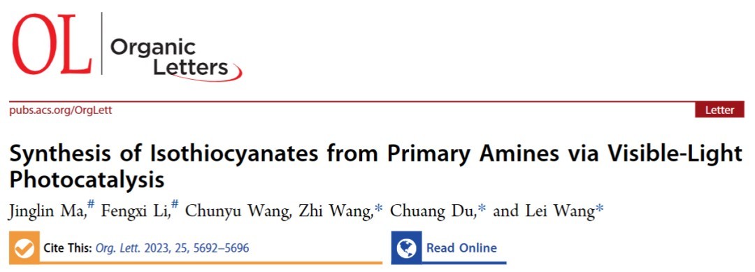 在对酶催化领域进行持续研究的同时,课题组也对光酶催化等新兴研究领域进行涉猎,通过搭建光催化实验装置和前期文献调研,对光催化合成研究有了一定的了解,以“Synthesis of Isothiocyanates from Primary Amines via Visible-Light Photocatalysis”为题,在国际权威学术期刊《Organic letters》(影响因子5.2,中科院分区一区)在线发表研究论文。论文中报道了一种以伯胺和二硫化碳为原料,光催化体系下,高效、温和地合成各种取代异硫氰酸酯的方法。该方法扩大了光催化的应用范围,并为制备脂肪族和芳香族异硫氰酸酯提供了一种新的策略,具有底物耐受范围广、对环境友好、可见光驱动的优点。论文第一完成单位为✅雷竞技raybet在线-英雄联盟,✅雷竞技raybet在线-英雄联盟硕士马婧琳和鼎新博后李奉熙为该论文的共同一作,吉林大学王磊、杜创和王智教授为该论文的共同通讯作者。