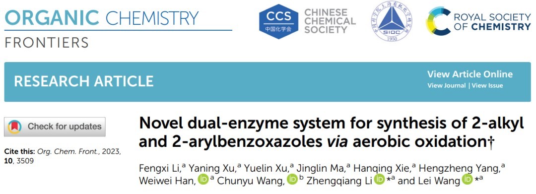 吉林大学分子酶学工程教育部重点实验室王磊教授课题组多年来一直致力于绿色高效酶促有机合成领域的研究,通过对血红蛋白进行辅因子替换并级联脲酶进行催化,以“Novel dual-enzyme system for synthesis of 2-alkyl and 2-arylbenzoxazoles via aerobic oxidation”为题,在国际权威学术期刊《Organic Chemistry Frontiers》(影响因子5.4,中科院分区一区)在线发表研究论文。论文中提出一种生物催化策略,通过脲酶-透明颤菌血红蛋白人工金属酶 (ArVHbM) 催化尿素、儿茶酚和醛的级联反应,高效合成 2-烷基苯并噁唑和 2-芳基苯并噁唑。论文第一完成单位为✅雷竞技raybet在线-英雄联盟,吉林大学鼎新博后李奉熙为该论文的第一作者,吉林大学分子酶学工程教育部重点实验室王磊、李正强教授为该论文的共同通讯作者。