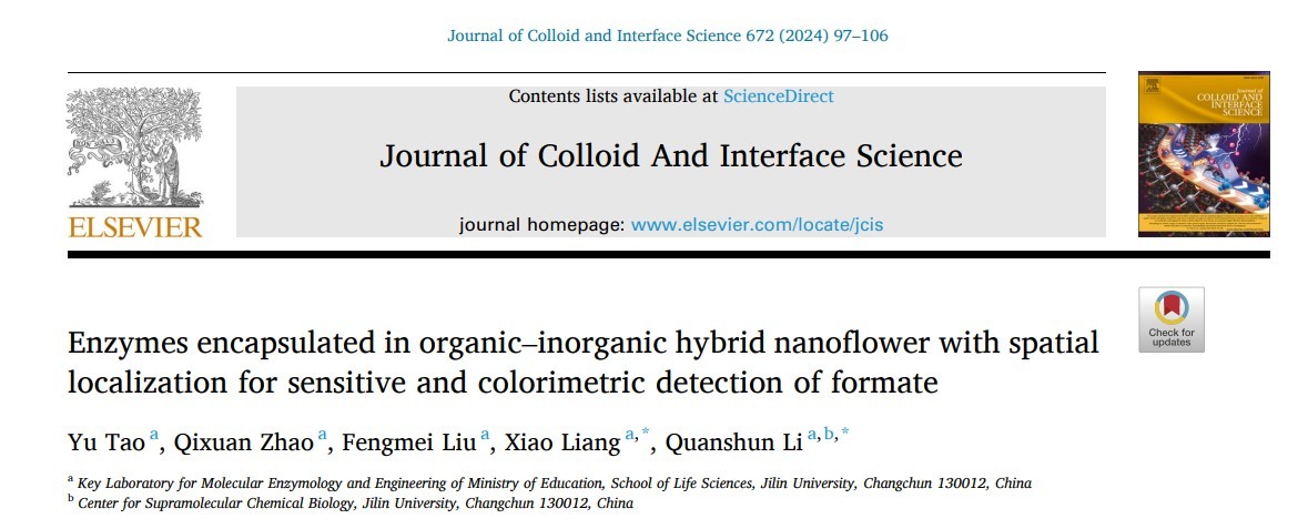 同时,课题组前期与吉林大学化学学院安泽胜教授团队合作,构建了甲酸氧化酶和辣根过氧化物酶组成的原子经济酶级联催化剂,实现了酶级联氧化还原循环的可逆加成-断裂链转移聚合及超高分子量聚合物的高通量合成(Angew. Chem. Int. Ed. 2022, 61: e202213396)。在此基础上,为进一步拓展甲酸氧化酶的应用范围,课题组成功构建了甲酸氧化酶/辣根过氧化物酶-无机材料组装体,通过双酶分子的空间定位效应实现了催化性能的优化,创制了具有良好检测灵敏度及特异性的便捷化甲酸传感体系,突破了当前甲酸检测依赖同位素标记气质联用、离子色谱等大型仪器设备的瓶颈,成功应用于环境、食品以及生物样品中痕量甲酸的检测。相关研究“Enzymes encapsulated in organic-inorganic hybrid nanoflower with spatial localization for sensitive and colorimetric detection of formate”发表于国际学术期刊Journal of Colloid and Interface Science。论文第一完成单位为✅雷竞技raybet在线-英雄联盟,博士生陶钰为该论文的第一作者,李全顺教授、梁骁博士为该论文的共同通讯作者。