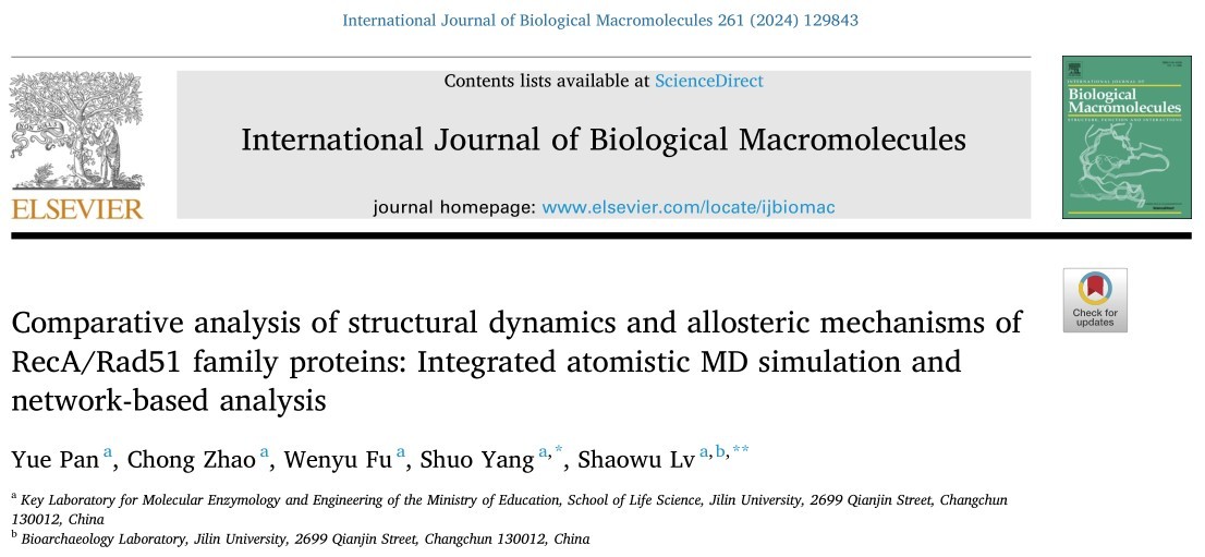 吕绍武教授、杨朔副教授科研团队深入解析了RecA/Rad51重组酶家族的结构动态和功能调控机制,为理解这些关键蛋白在同源重组中的作用提供了新的视角。研究成果于2024年1月30号在学术期刊《International Journal of Biological Macromolecules》正式发表(Comparative analysis of structural dynamics and allosteric mechanisms of RecA/Rad51 family proteins: Integrated atomistic MD simulation and network-based analysis)。论文第一完成单位为✅雷竞技raybet在线-英雄联盟,✅雷竞技raybet在线-英雄联盟潘跃博士为该论文的第一作者,吉林大学吕绍武教授和杨朔副教授为该论文的共同通讯作者。