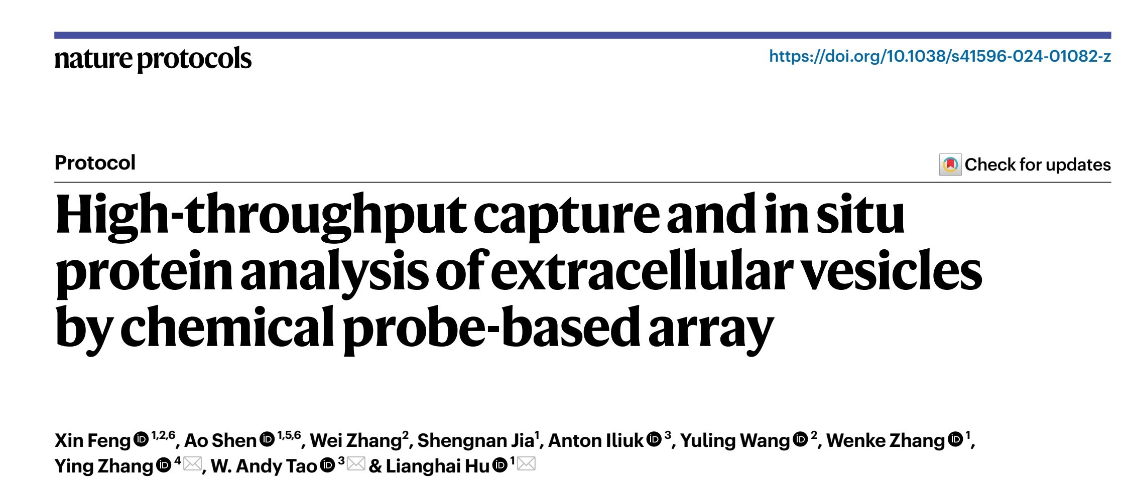 吉林大学胡良海教授联合美国普渡大学陶纬国教授和复旦大学张莹教授,开发了外泌体高通量捕获和原位蛋白质分析的一体化平台,以题为High-throughput capture and in situ protein analysis of extracellular vesicles by chemical probe-based array在线发表在Nature Protocols上。