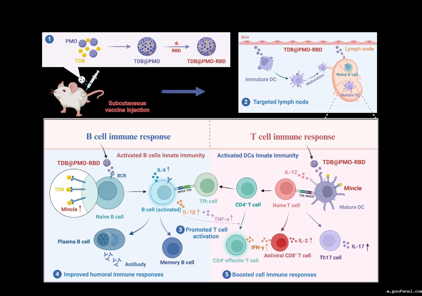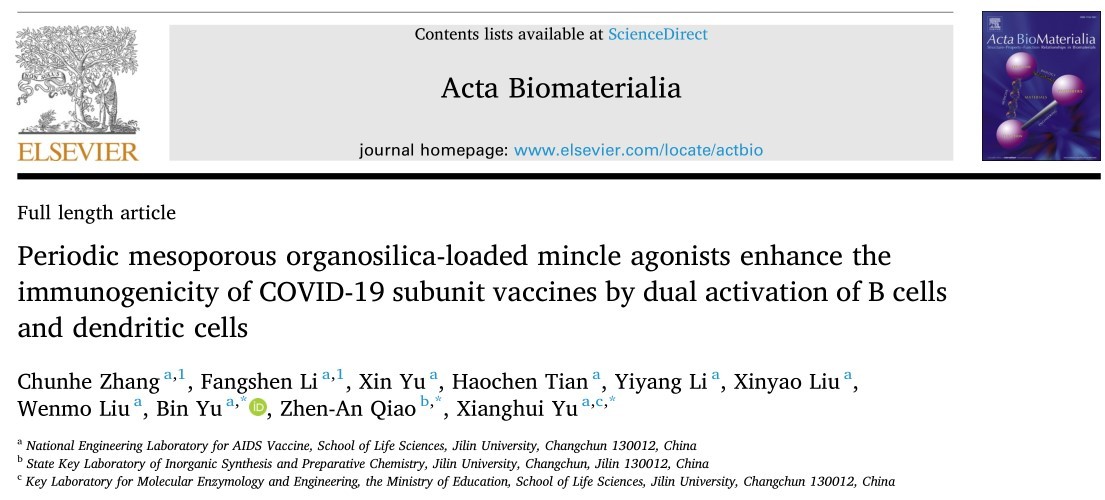 吉林大学艾滋病疫苗国家工程实验室于湘晖教授/于彬教授团队与吉林大学无机合成与制备化学国家重点实验室乔振安教授合作,设计了一种复合型的纳米佐剂TDB@PMO,研究发现其能有效地将抗原递送到淋巴结,增强APC的抗原提呈。同时,TDB@PMO佐剂可同时激活B细胞和DC细胞的固有免疫Mincle信号通路,进一步增强生发中心(GC)应答和SARS-CoV-2 特异性的体液和细胞免疫反应。相关研究成果以“Periodic mesoporous organosilica-loaded mincle agonists enhance the immunogenicity of COVID-19 subunit vaccines by dual activation of B cells and dendritic cells”为题在《Acta Biomaterialia》杂志发表。