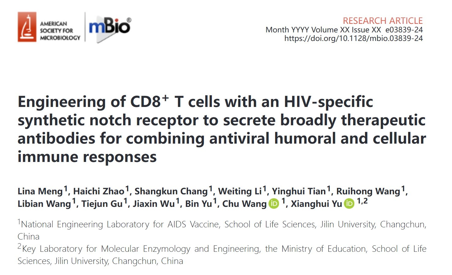 吉林大学艾滋病疫苗国家工程实验室于湘晖教授和王储副教授团队于2025年2月在《mBio》杂志在线发表了题为“Engineering of CD8+ T cells with an HIV-specific synthetic notch receptor to secrete broadly therapeutic antibodies for combining antiviral humoral and cellular immune responses.”的工作。该研究利用能够对细胞功能进行自由定制的synNotch受体技术改造人CD8+ T细胞,使其在特异性识别病毒抗原后,可控地分泌bNAb和双特异性T细胞衔接蛋白(BiTE),创新性地赋予CD8+ T细胞同时发挥抗HIV广谱中和作用和细胞杀伤作用的双重能力,从而达到直接中和游离病毒以及介导T细胞靶向杀伤病毒感染细胞这两种目的。这种新型双功能T细胞集成了治疗分子bNAb和BiTE的局部和系统性抗病毒效应,对病毒潜伏感染细胞具有显著清除效果,有潜力成为未来临床治疗HIV感染的有效候选策略。