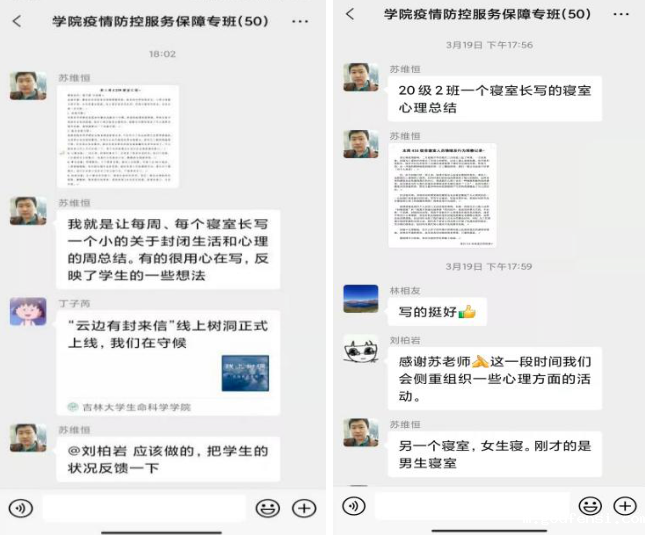 为加强全面疏导和精准指导,全体班主任与学工队伍不断创新工作方法,积极回应学生关切、解决学生诉求,通过专业化的心理辅导、亲情化的思想关怀、常态化的教育引领,引导学生平和心态、阳光战“疫”。结合重要时间节点,通过组织主题班会、小组会议,谈心谈话等形式,就学生关心的考研、保研、就业、毕业设计等问题进行逐一回应,为学生答疑解惑、排忧解难;通过自制接龙小程序、组建学习小组、开展线上打卡、撰写抗疫日记等方式,引导学生缓解紧张情绪、合理规划时间,加强体育运动和自我管理。