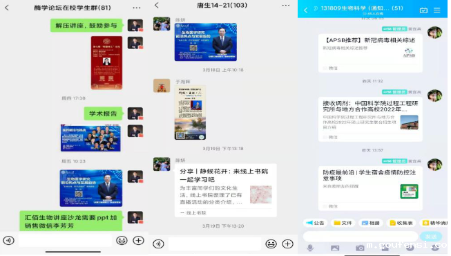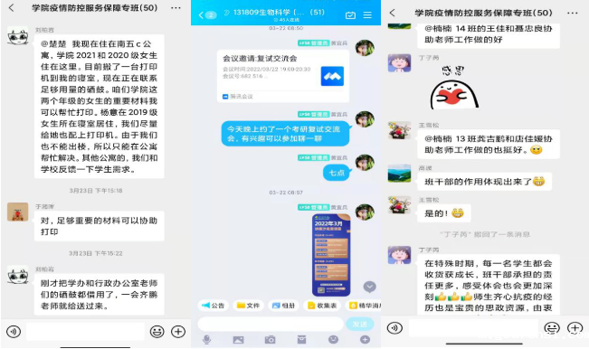 为持续提升人才培养质量,学院积极探索实施疫情防控期间班主任—辅导员协同育人工作举措,总结凝练特殊时期具有生科特色的三全育人工作体系。学院全体班主任老师与学工队伍协同配合,积极应“战”,科学应对,在学院统筹部署下,开展多形式、分层次、全覆盖的主题教育活动,按下协同育人的“快进键”。