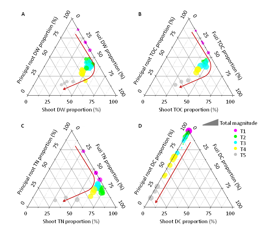 图2. 北乌头(A)干物质量、(B)总有机碳、(C)总氮和(D)防御性化合物的分配趋势始终朝向附子