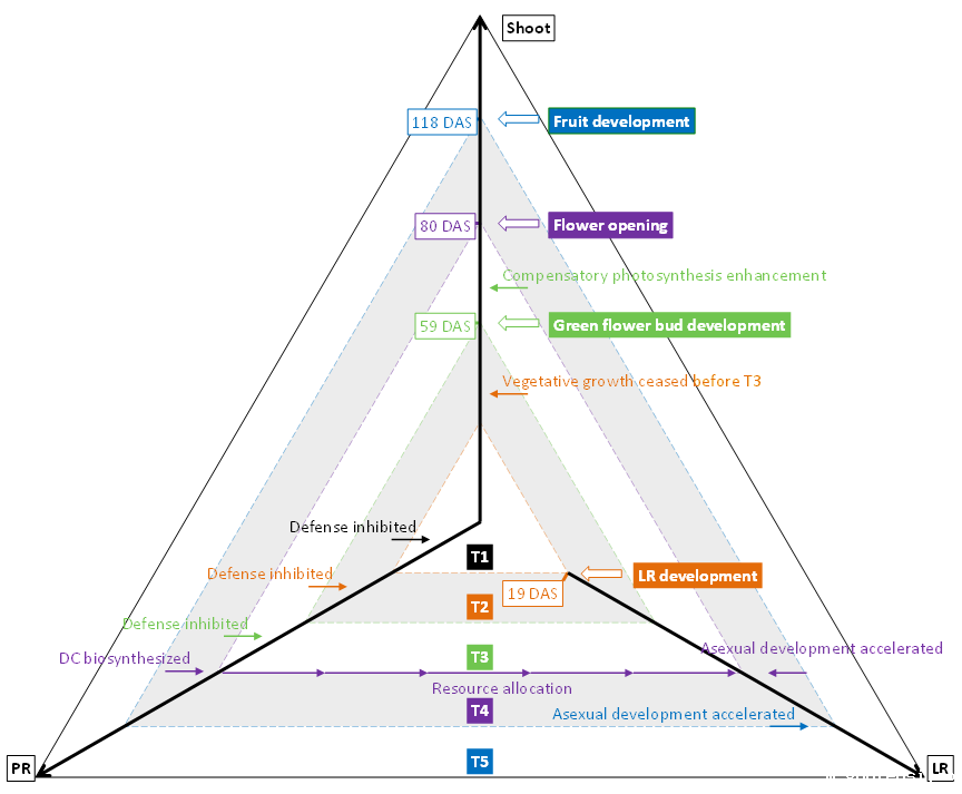 转录组测序和代谢物含量分析的结果进一步表明:CDPS和KS是防御性化合物合成的潜在关键基因。在花器官发育完成后,主根替附子合成了防御性化合物,并将资源和防御性化合物加速转运在附子,确保了植株可以同时加速无性发育和防御性化合物的积累。