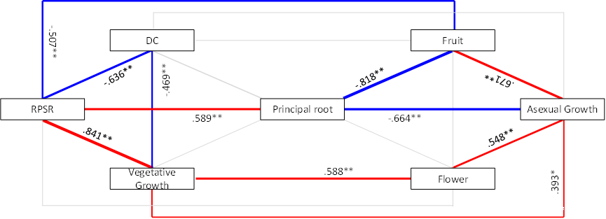 图3. 从相关性的角度而言,北乌头主根(Principal root)处于资源分配的中心位置