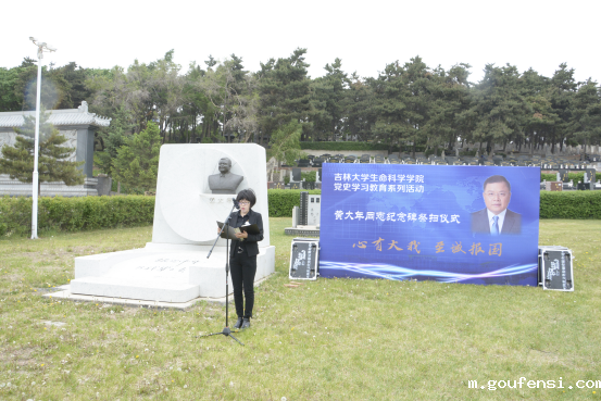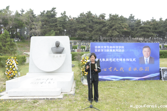 学院微生物学与免疫学系教工党支部书记单亚明代表教师发言 ,他说道“祭扫黄大年同志纪念碑,站在‘两个一百年’奋斗目标的历史交汇点上,作为党员,我们应当继续传承发扬黄大年老师心有大我、至诚报国的爱国情怀。教书育人、敢为人先的敬业精神,淡泊名利、甘于奉献的高尚情操。以‘只要祖国需要,我必全力以赴’的坚定勇气。迎接‘双一流建设’船到江心的关键期,应对祖国发展改革攻坚的发力期,勇担职责使命,不负时代重托。”