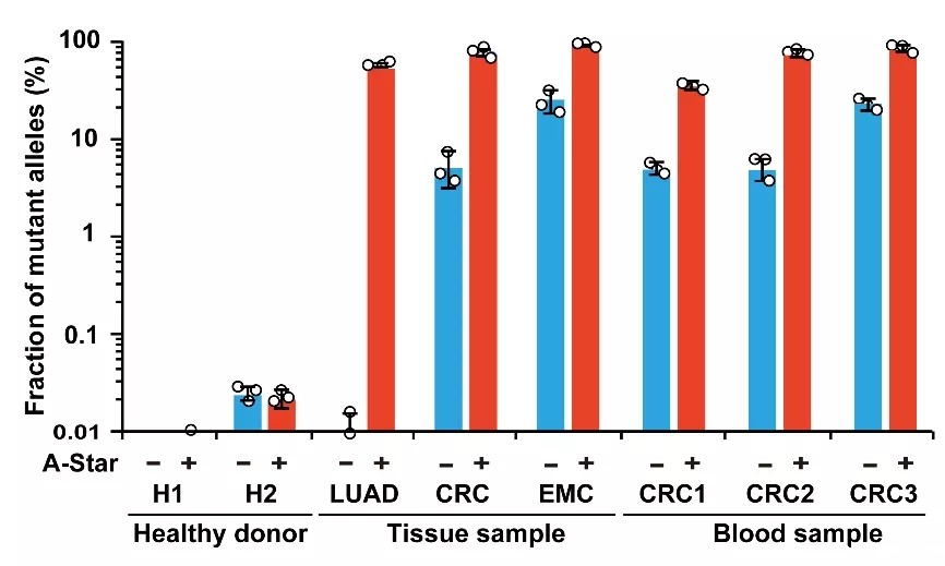 研究人员测试了A-Star对KRAS、PIK3CA和EGFR等多个肿瘤突变基因的富集效果,证实A-Star能够轻松检测和定量0.01%的稀有突变,富集效率高达5,500倍。