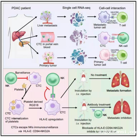 该研究工作的主要创新点包括:1)发现血液循环、原发灶和转移灶肿瘤微环境中肿瘤细胞与免疫细胞间的相互作用显著不同;2)发现CTCs通过免疫检查点分子对HLA-E:CD94-NKG2A逃避宿主免疫监视的新机制;3)证实了阻断免疫检查点HLA-E:CD94-NKG2A可抑制肿瘤转移,为治疗肿瘤转移提供了新的靶点;4)发现CTCs通过内吞血小板获得RGS18基因,从而帮助CTCs逃避NK细胞的免疫监视。