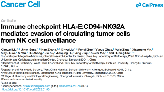 近日,✅雷竞技raybet在线-英雄联盟校友、四川大学华西医院生物治疗国家重点实验室石虎兵教授团队在顶级期刊Cancer Cell(IF:38.585)上以封面文章形式发表了题目为Immune checkpoint HLA-E:CD94-NKG2A mediates evasion of circulating tumor cells from NK cell surveillance的研究论文。该研究发现了CTCs与NK细胞间新的免疫检查点分子对HLA-E:CD94-NKG2A,阐明了CTCs逃避宿主免疫监视的新机制,进而提出靶向免疫检查点HLA-E:CD94-NKG2A抑制肿瘤转移的治疗策略。