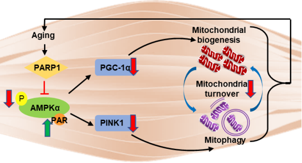 机制研究表明,骨骼肌特异性敲低PARP1上调PGC-1α的表达而使线粒体生成增加,同时上调PINK1表达而促进了线粒体自噬对破损线粒体的清除。本研究首次解释了DNA损伤修复基因Parp1的抑制对能量代谢关键分子AMPKα的精确调控,通过增加线粒体生成和控制线粒体质量,完成骨骼肌中线粒体的高效周转,从而增强骨骼肌代谢功能,实现寿命的延长,提示PARP1抑制除了在癌症肿瘤方面起作用,对延缓衰老也有益处。